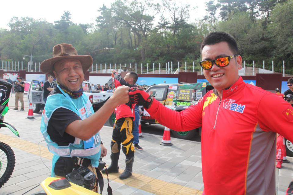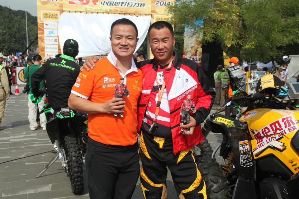 右邊這位就是戰無不勝、攻無不克的ATV組冠軍車手——胡愛東!站在他旁邊的就是環塔鐵軍本尊了,ATV組亞軍,現在擔任“美年大健康•完美中國•勇之隊”的領隊。