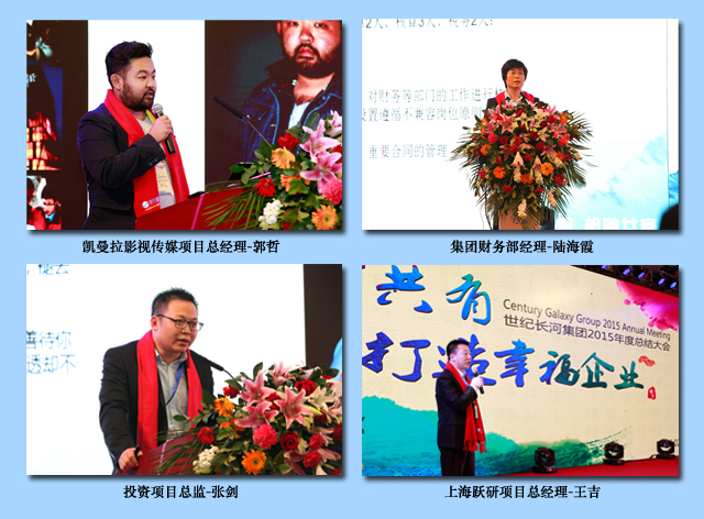 “Make use of philosophical thought to build happy enterprise.” On Feb. 27, 2016, 2015 annual summary of Century Galaxy Group was held in Huabei Hotel in Beijing. The chairwoman Ms. Guo Meiling, the president Mr. Zhao Qi, the vice-president Ms. Zheng Baowen and the general manager Guo Xinkai attended the summary. The other people who attended the summary included the head of group headquarters, each branch company and project department, staff representatives and special guests.